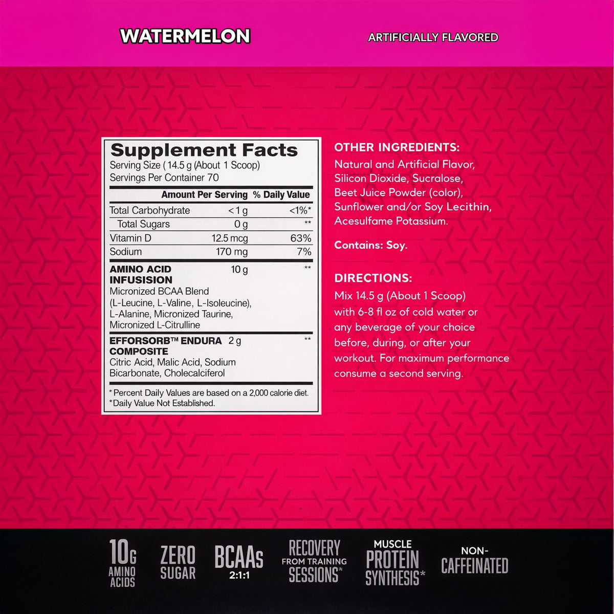 Suplemento alimenticio en polvo, formulado con aminoácidos de cadena ramificada (BCAA) —incluyendo L-leucina, L-isoleucina y L-valina— junto con otros ingredientes incluidos en la matriz del producto. AMINO-X es presentado por BSN como una fórmula efervescente que se mezcla con agua para formar una bebida, disponible en sabores variados según inventario del fabricante y distribuidores.